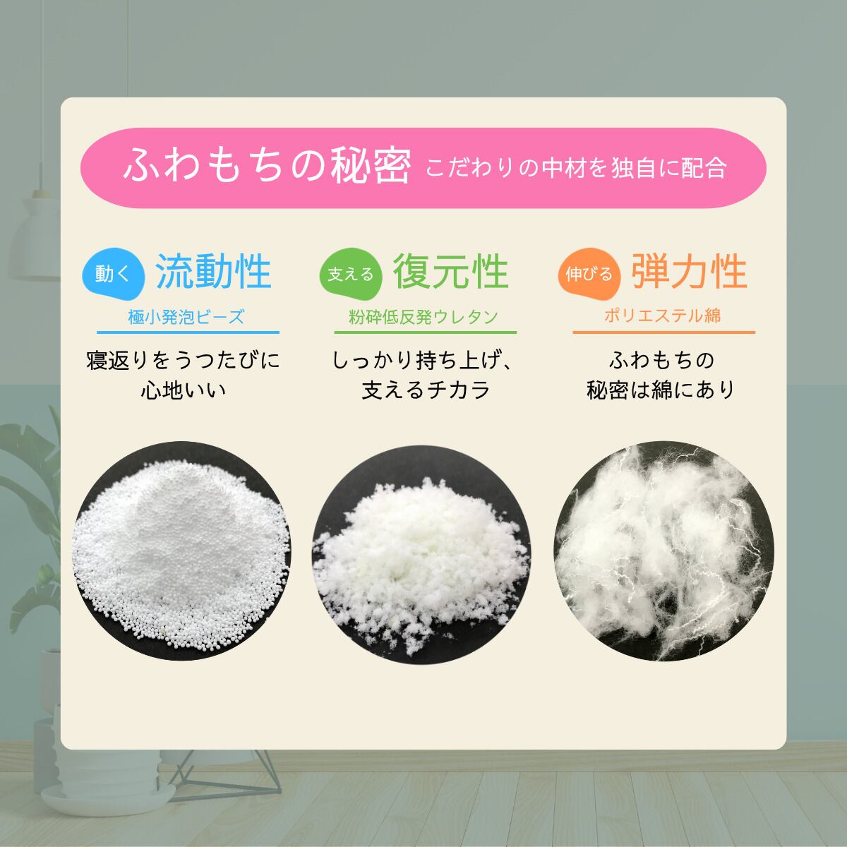 中材と生地とのコンビネーションによって、ふわふわ&モチモチ感を存分に味わえ、心地よいフィット感を得られます。