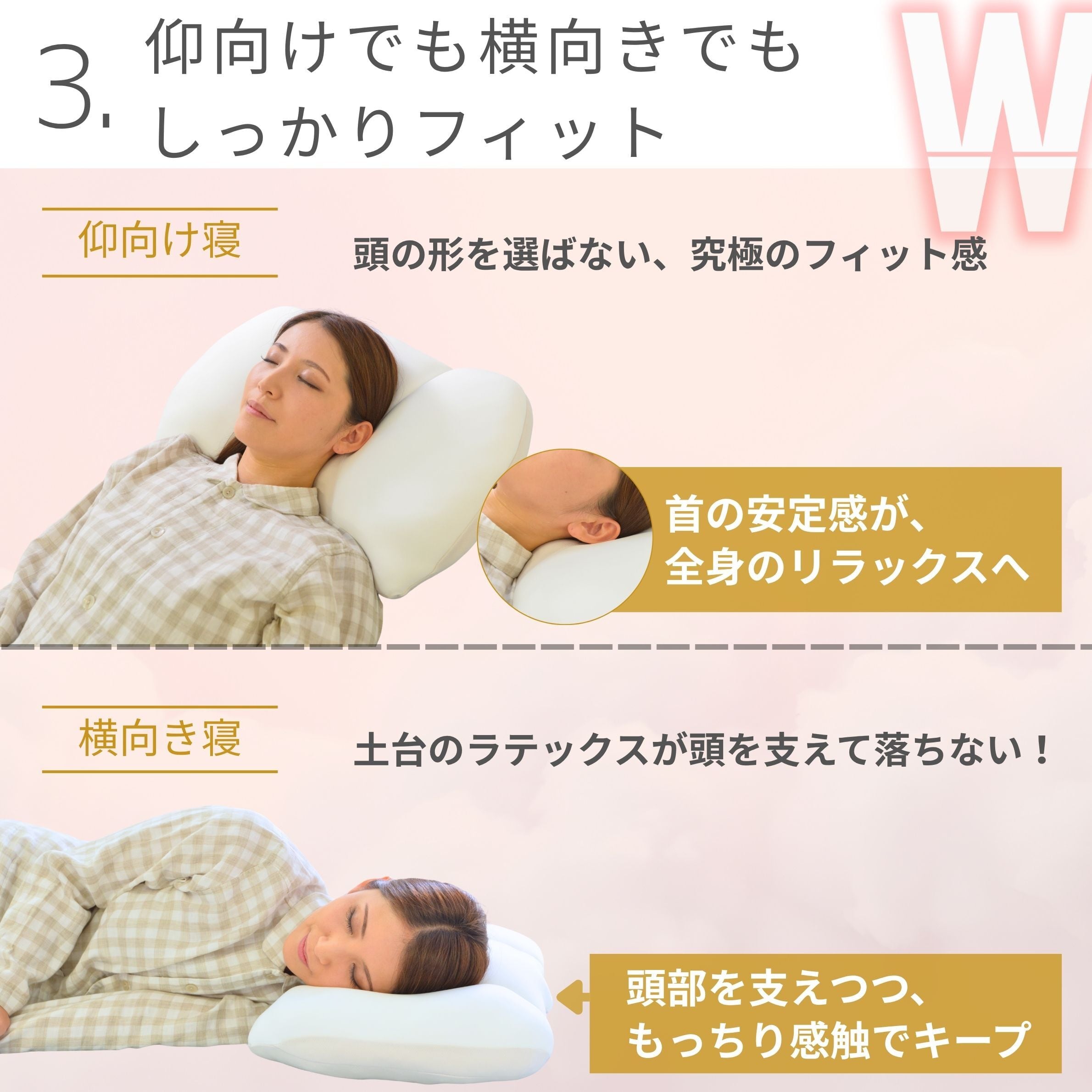 「女神の無重力まくら」シリーズから、フィット感と安定感を極限まで高めた【極ふわフィットW】が登場。頭を乗せた瞬間から朝まで、まるで浮遊しているような心地よさを提供します。