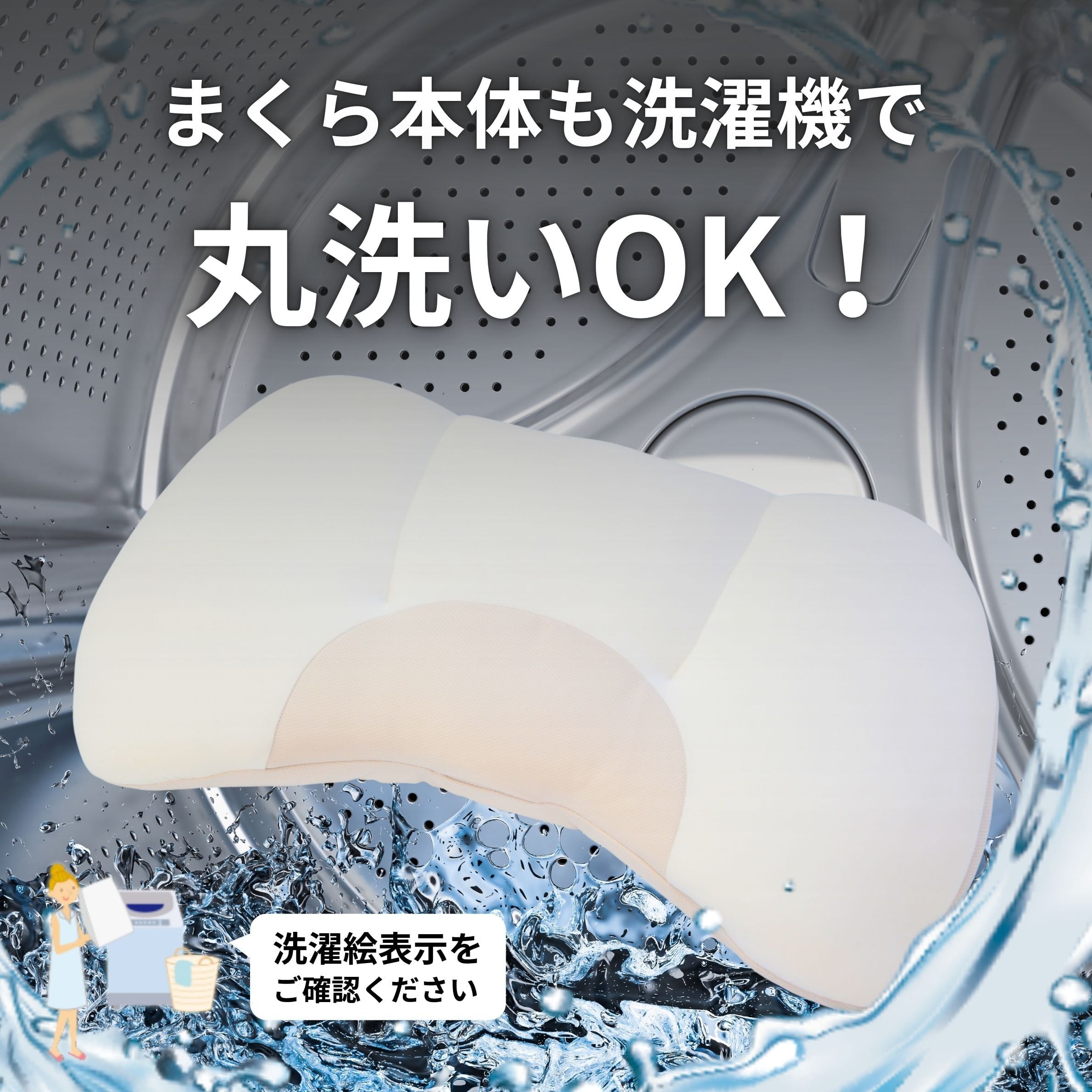 本体も洗濯機洗いが可能(ネット使用)。カバーはファスナーを使わず、シルキータッチで気持ちのよいレーヨン混素材で、抗菌防臭加工をしています。360度どの方向にも伸びるので、枕の伸縮を損ないません。