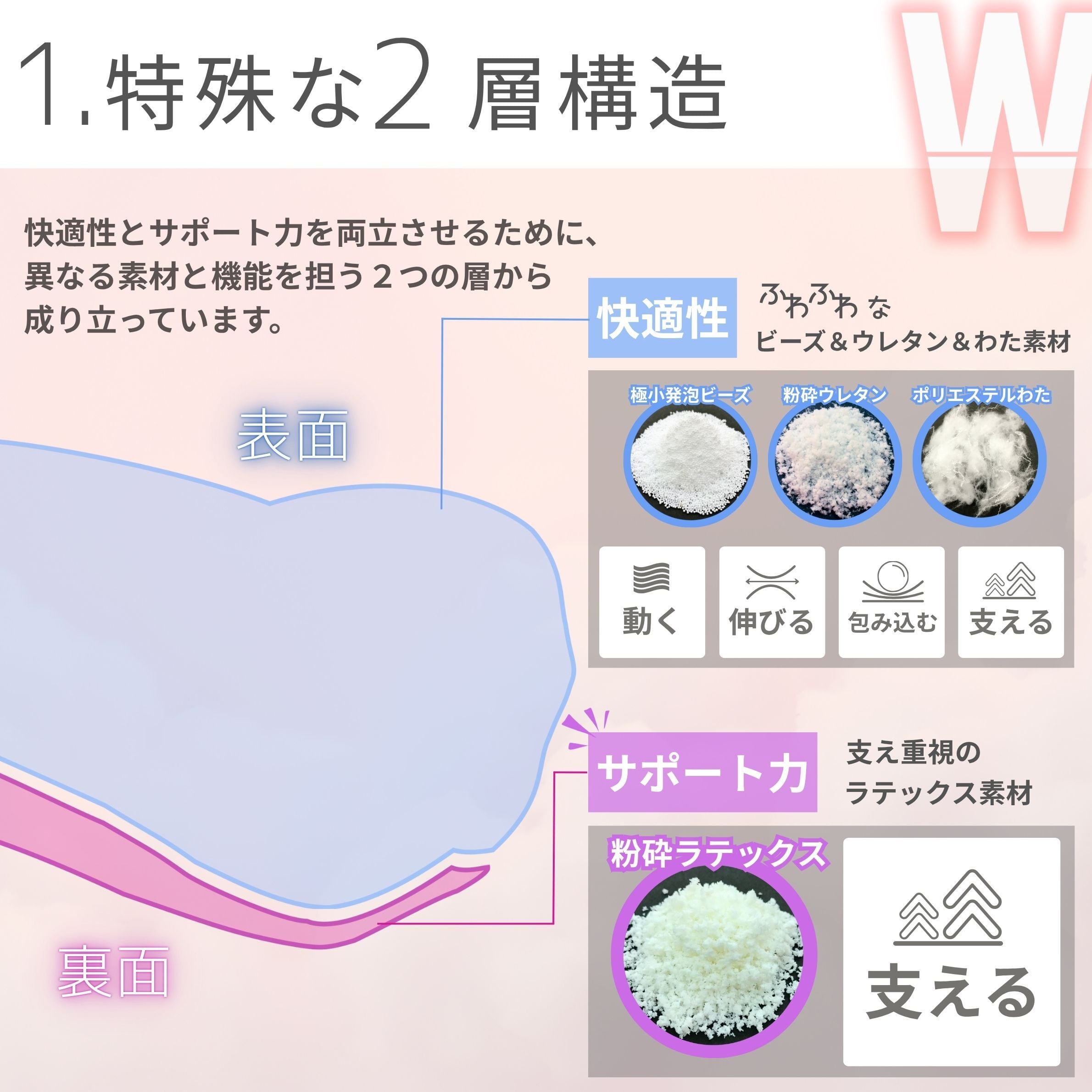 頭を置いた瞬間に「密着」: 極小発泡ビーズ、粉砕低反発ウレタン、ポリエステル綿を独自のバランスでブレンド。頭の形に合わせてもっちりと流動的にフィットし、体圧を優しく分散します。
