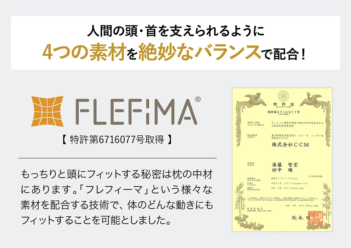 本品の中材は「FLEFIMA-フレフィーマ※」。枕内部は頭部と首部で仕切りを設け、中材に使う3種の素材(粉砕ウレタン、ポリエステルわた、極小発砲ビーズ)の配合率を変えています。枕本体に使用される中材を配合する技術で特許を取得しています。(特許:第671077号)