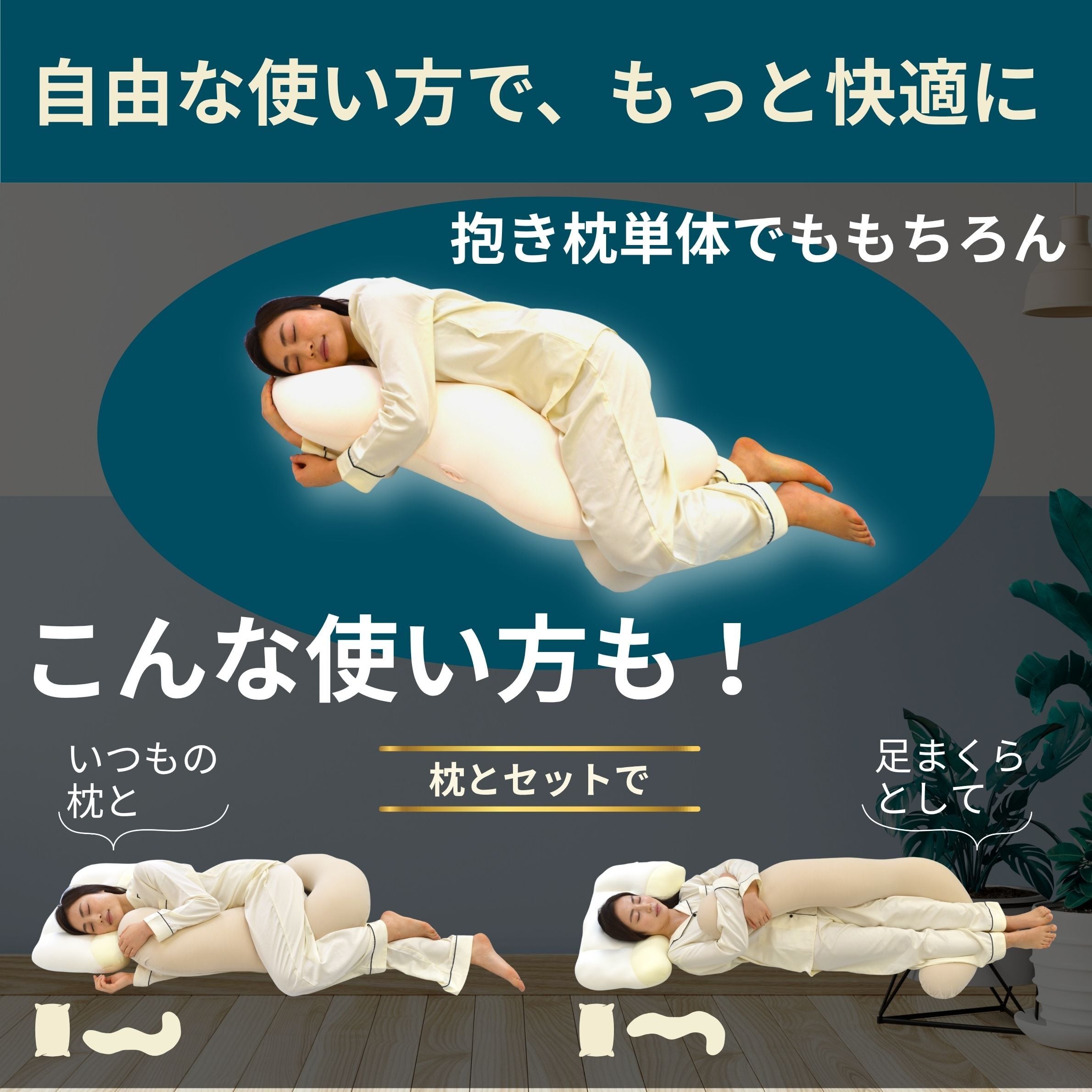 【自由な使い方で、もっと快適に】 使い方は自由自在。メインの枕代わりとして、あるいは既存の枕とセットで上半身を包み込むように使うのもおすすめです。あらゆる抱き方や寝姿勢で、その日のあなたに合わせた最適なフィット感を提供します。
