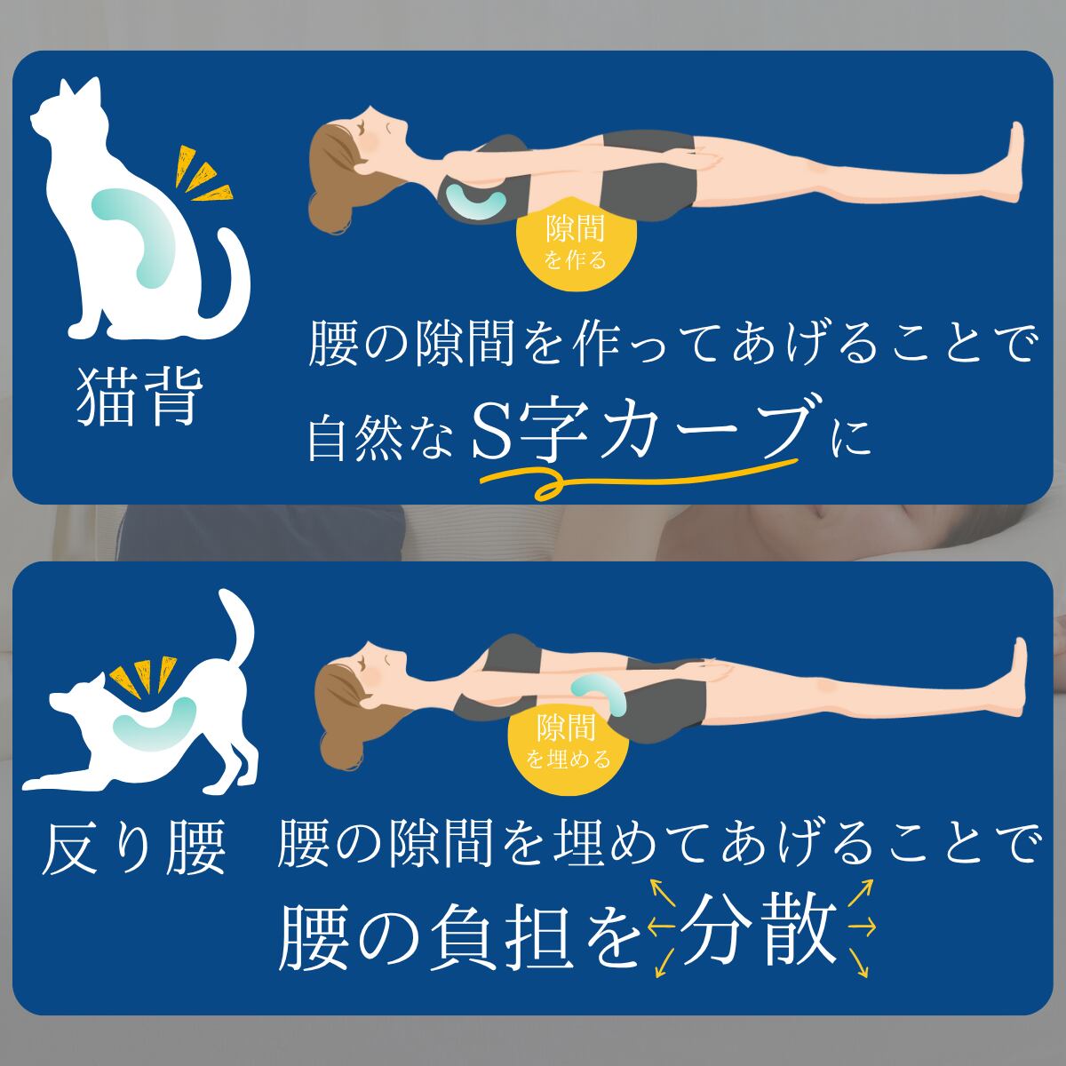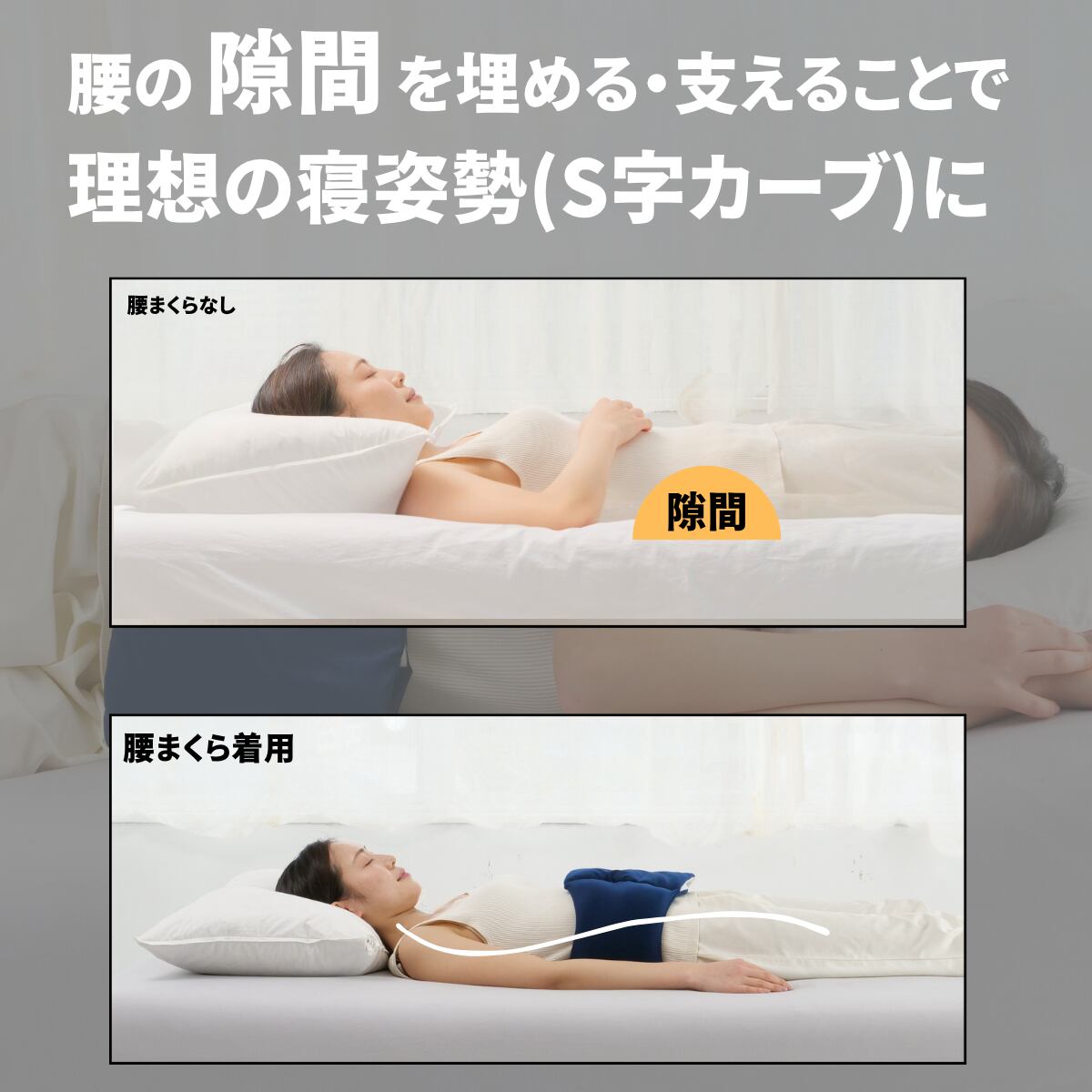 寝姿勢の悩みは人それぞれ。この腰まくらは、巻く位置やフィット感の調整により、猫背の方にも反り腰の方にも対応します。
