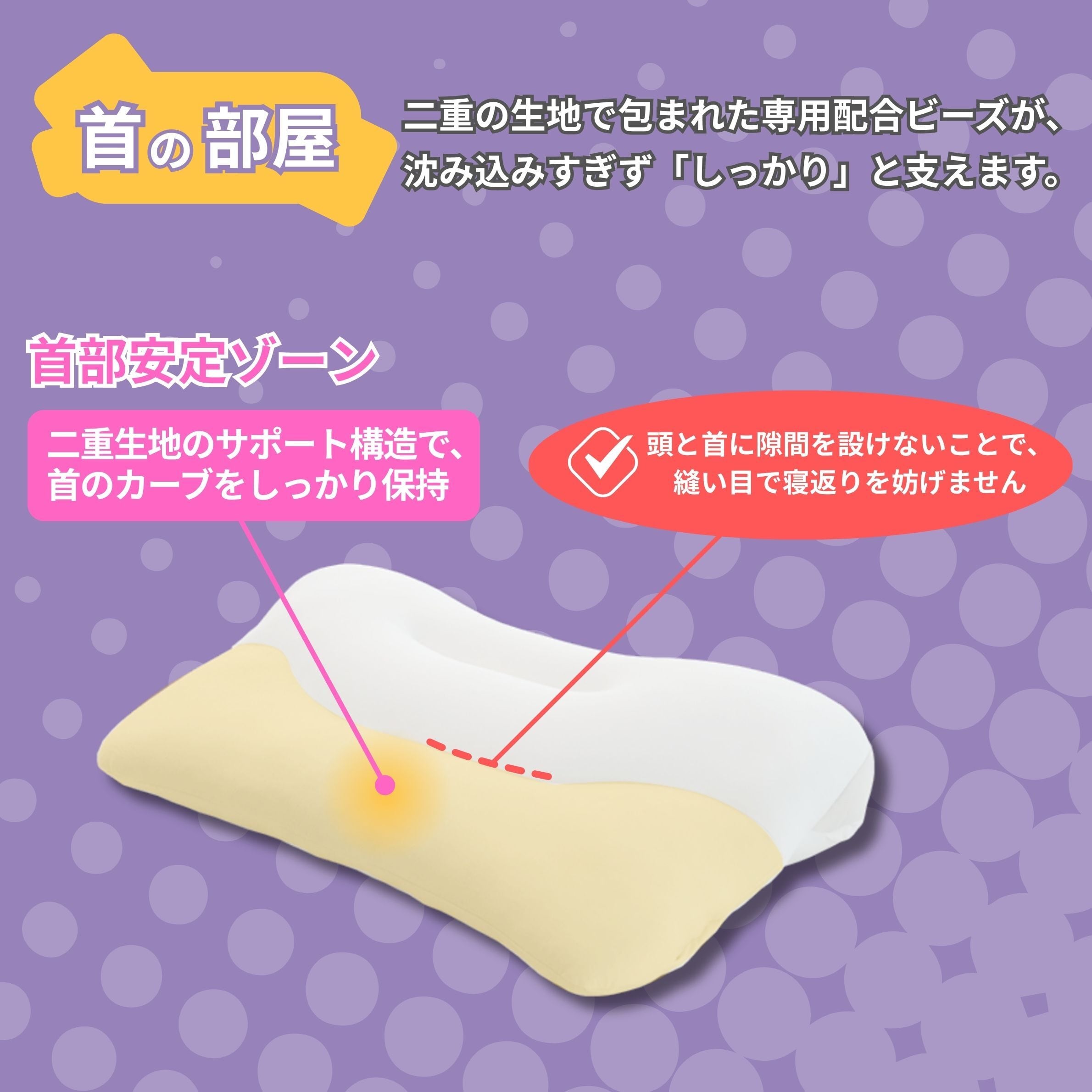 首の部屋:二重の生地で包まれた専用配合のビーズが、沈み込みすぎず「しっかり」と支えます。
