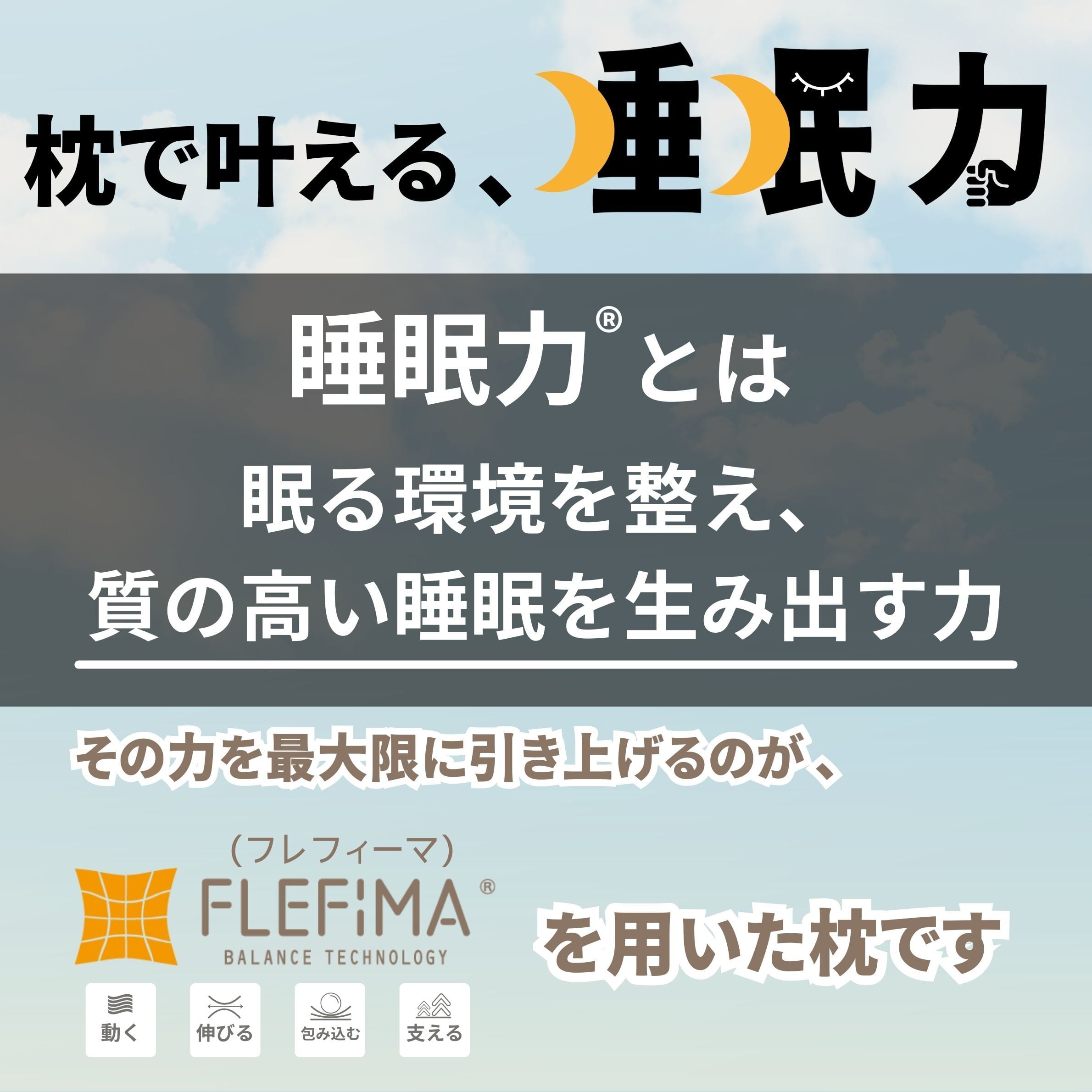 本品の中材は「FLEFIMA-フレフィーマ※」。枕内部は頭部と首部で仕切りを設け、中材に使う3種の素材(粉砕ウレタン、ポリエステルわた、極小発泡ビーズ)の配合率を変えています。枕本体に使用される中材を配合する技術で特許を取得しています(特許:第6716077号)
