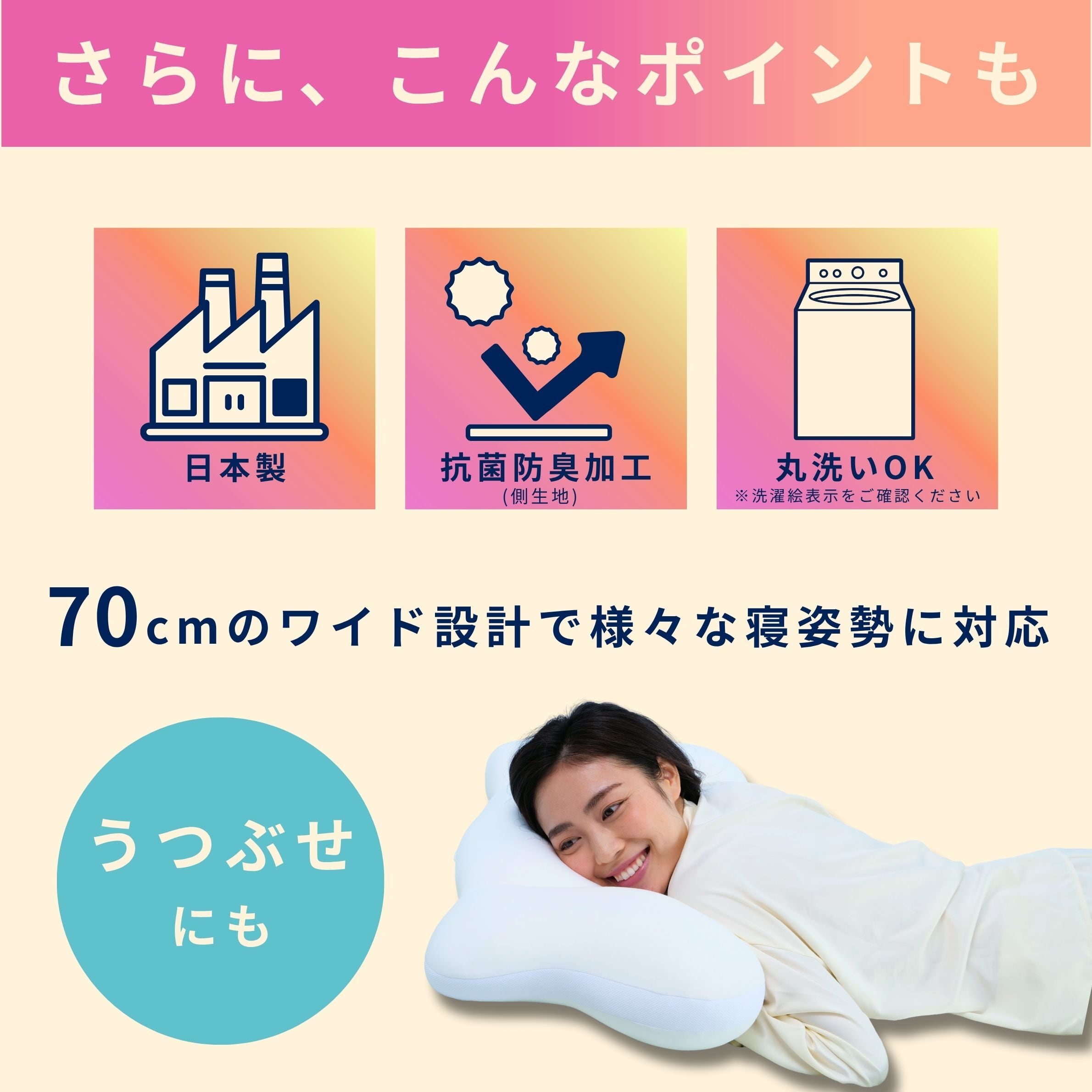今回新たに、まくら本体・専用カバーに「抗菌防臭加工」を追加して、より清潔に使用することが出来ます。