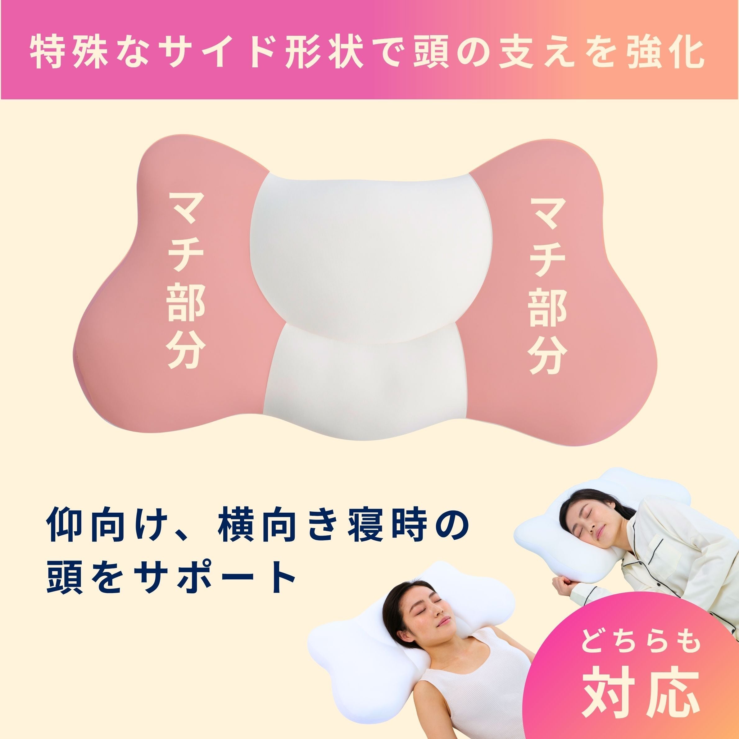 また、両サイドにボリュームを持たせて丸みのある形状にする事により、横向き寝の安定性を確保する構造になっています。